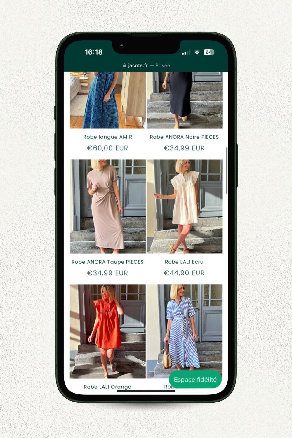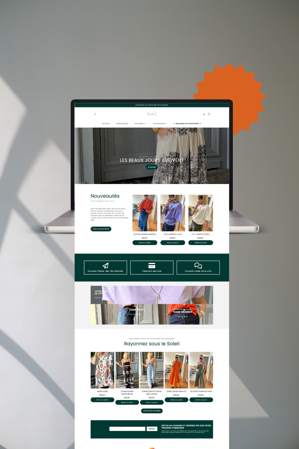 Jacote, ma première cliente, souhaitait développer sa partie e-commerce pour compléter ses deux boutiques physiques. Lors de notre audit initial, nous avons constaté que le problème résidait dans le site internet plutôt que dans la communication sur les réseaux sociaux, comme en témoignait le faible taux de conversion. J'ai donc entrepris une refonte complète du site : une nouvelle charte graphique adaptée, des éléments de réassurance, un design responsive, une arborescence plus claire, et des collections spéciales pour dynamiser le site. En parallèle, j'ai mis en place un programme de fidélité, un chat en ligne pour un service client réactif, et des e-mails marketing automatisés pour récupérer les paniers abandonnés et fidéliser les clients.